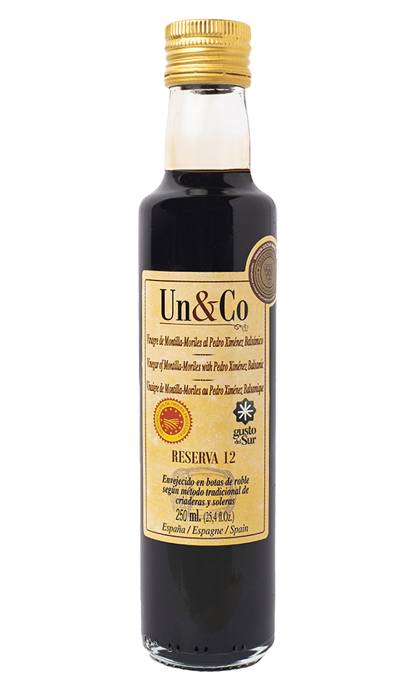 Este vinagre de calidad superior se elabora mediante el tradicional método de fermentación oxidativa, seguido de un prolongado envejecimiento en botas de roble americano. Gracias a su tiempo de crianza y a la excelencia de sus ingredientes, cuenta con la certificación de la Denominación de Origen Protegida Montilla-Moriles, que lo reconoce como vinagre Reserva.